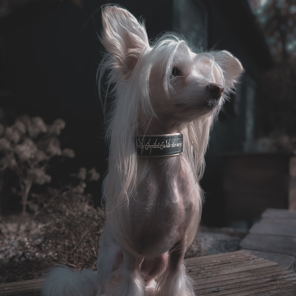 Das Halsband „Keeper’s Bond“ – Medium vereint Eleganz und eine mystische Aura, inspiriert von epischen Abenteuern. Mit seinen edlen metallic Akzenten in elbischer Schrift verleiht es deinem Hund eine außergewöhnliche Ausstrahlung. Ob bei einem ausgedehnten Spaziergang im Wald oder beim Treffen mit anderen Vierbeinern – mit dem „Keeper’s Bond“ wird dein Hund garantiert zum Blickfang!